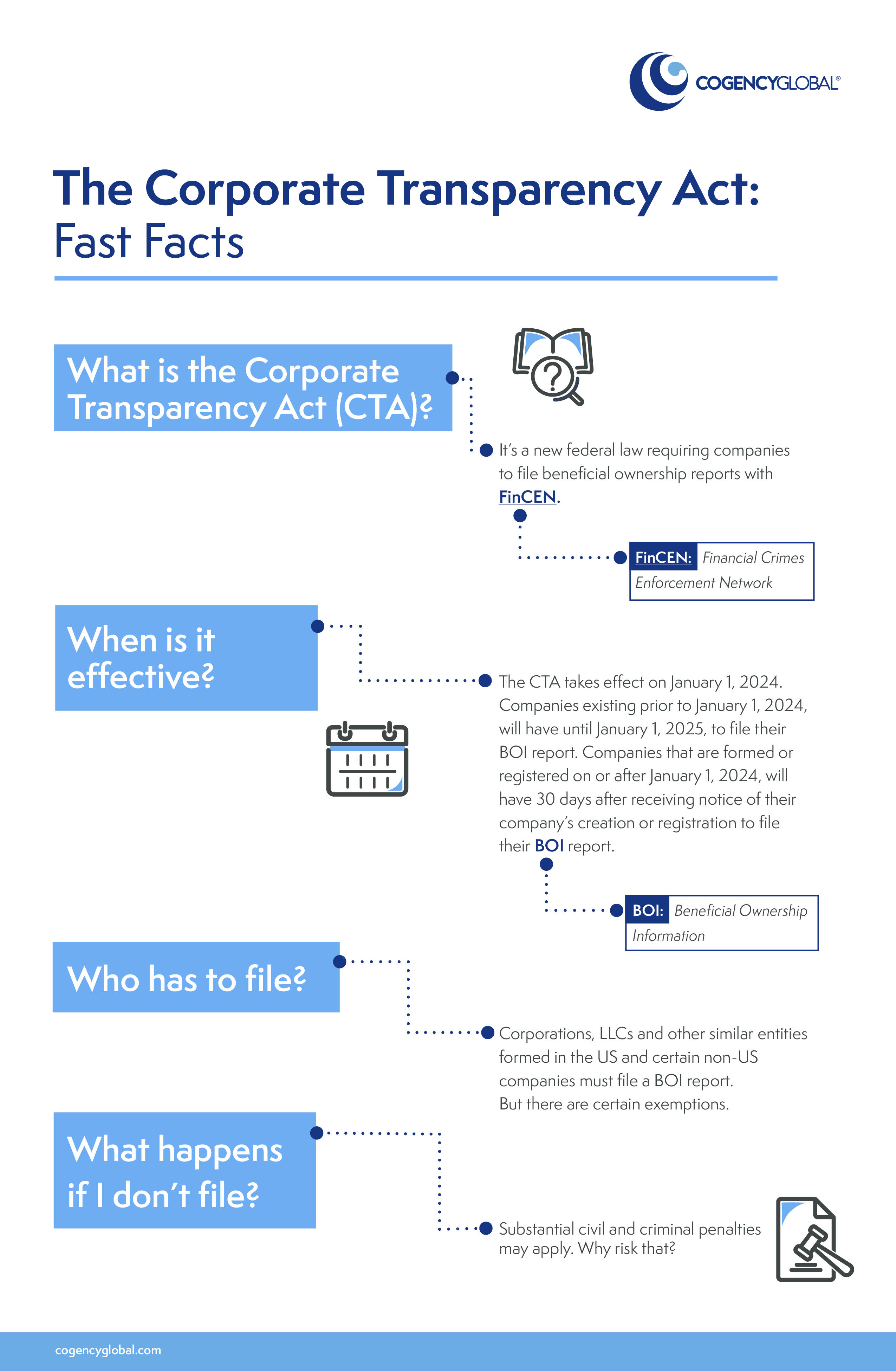 If you are interested in knowing more about what Cogency Global is doing with the Corporate Transparency Act, you can find more answers in our article, 10 Frequently Asked Questions About the Corporate Transparency Act.
