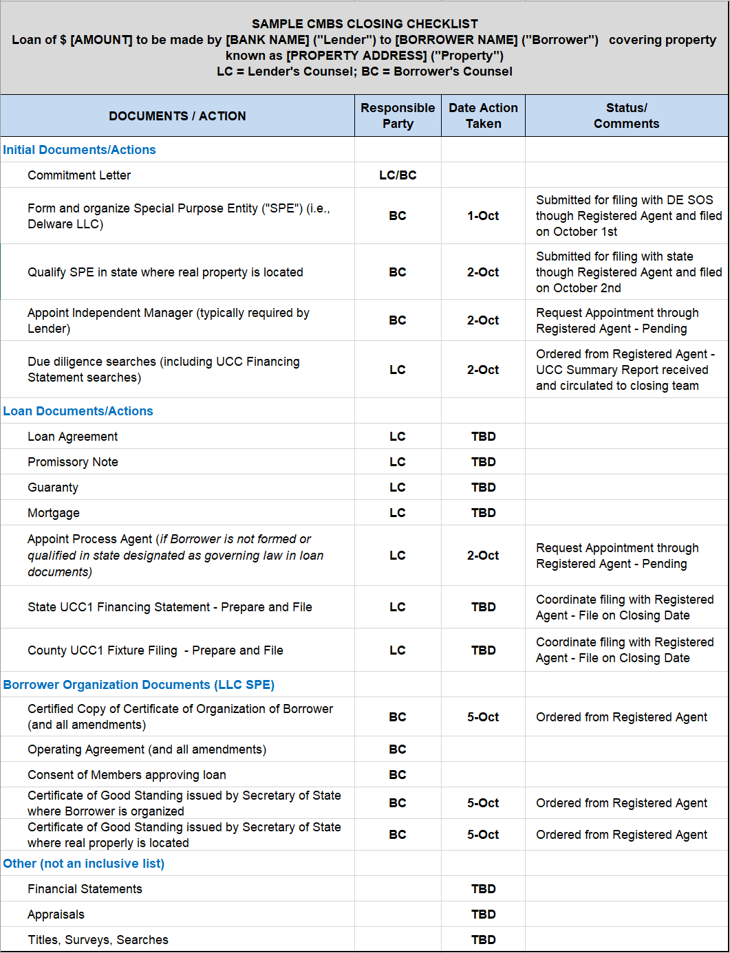 Keep in mind, your closing checklist is a living document. Deadlines can change and additional documents or actions might be added as the CMBS transaction is negotiated. Closely managing and maintaining your closing checklist as these complex financing transactions proceed is an important key to a successful closing.